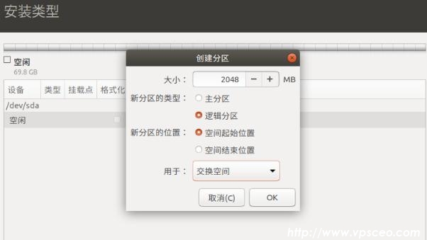 Swap(相当于电脑内存):逻辑分区、大小设置为电脑内存大小,2G,4G;